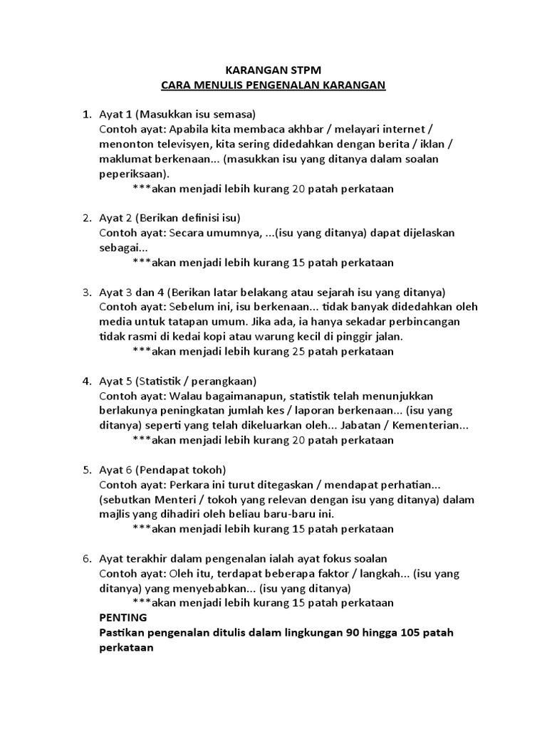 Koleksi Contoh Karangan Esei Bahasa Malayu BM STPM 1Sijil Tinggi Persekolahan Malaysia. Mempunyai isi yang mencukupi iaitu 4-5 isi 4-5 Per e nggan Setiap perenggan mempunyai isi huraian dan contoh 8-10 Baris. Mesti padat dan ringkas dan sekurang-kurangnya 6-8 baris 2.